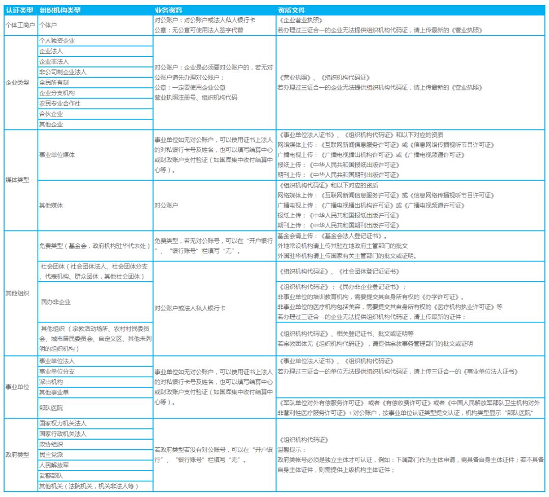 微信认证选择微信众帐号认证类型时,请您根据“组织机构代码证”显示的机构类型进行选择,并提供对应的资质