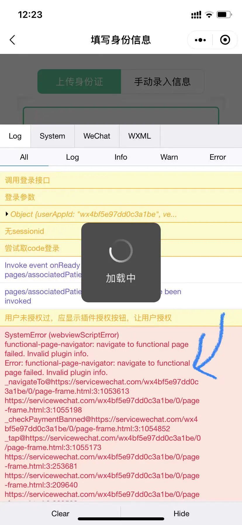 【表现】:正常搜索进入是可以授权跳转到电子健康卡的;但是从小程序页面B形成的二维码进入,插件就报错了