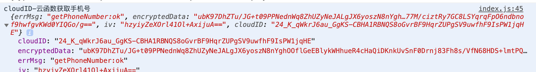 getPhoneNumber: function (e) { console.log("cloudID-云函数获取手机号", e.detail) wx.cloud.callFunction({ name: 'cloudID', data: { weRunData: wx.cloud.CloudID(e.detail.cloudID), // 这个 CloudID 值到云函数端会被替换 obj: { shareInfo: wx.cloud.CloudID(e.detail.cloudID), // 非顶层字段的 CloudID 不会被替换,会原样字符串展示 } }, success: res => { let result = res.result; } })} |