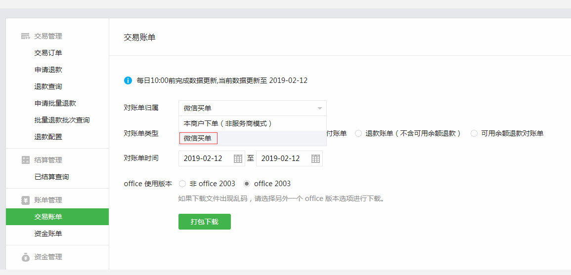 通过微信API接口下载对账单(https://api.mch.weixin.qq.com/pay/downloadbill )查询到的的交易记录只是(见下图):交易账单 - 对账单归属为本商户下单。而对账单归属为微信买单的账单却没有。