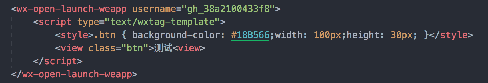 <div style="position: fixed; ..."><div style="position: absolute; ...">打开</div><wx-open-launch-weapp username="..."><script type="text/wxtag-template"><button style={{ width: maxWidth, height: 50, lineHeight: 50px}}>打开小程序,享更多服务</button></script><wx-open-launch-weapp></div>咱们一样的问题,目前只有颜色设置生效,宽高设置无效果,100%,px,rpx,rem都不生效,楼主有解决思路了么?