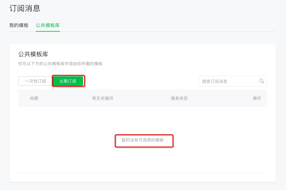 PS:现在的情况是,能看到长期订阅消息的tab,但是点击进去后,页面是空白的,无法添加模板。