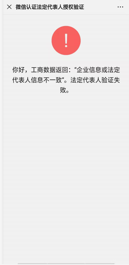 公众号微信认证一直不通过,工商数据返回:‘企业信息或法定代表人信息不一致