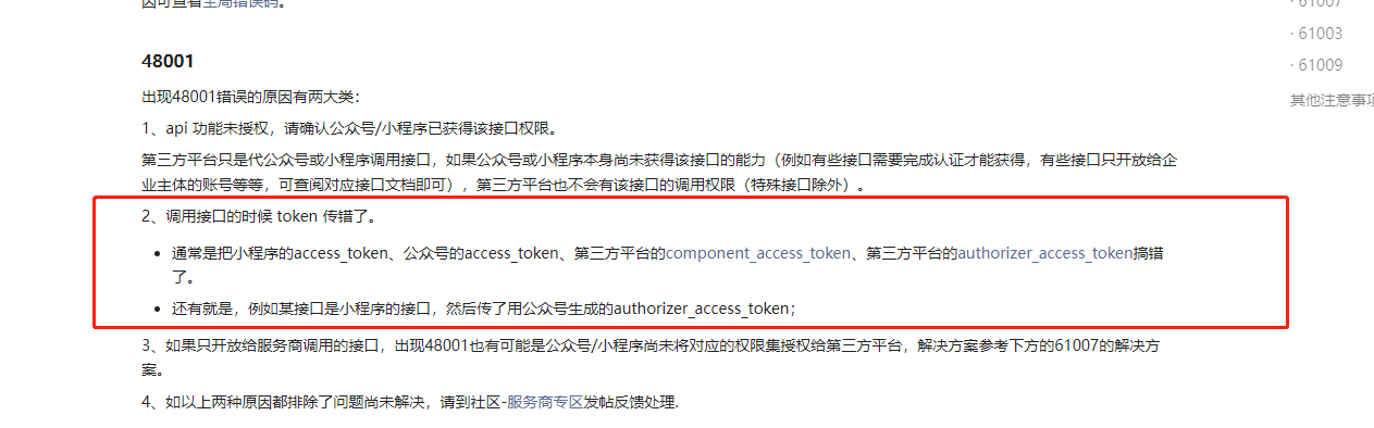 48001:https://developers.weixin.qq.com/doc/oplatform/Third-party_Platforms/2.0/troubleshooting/third_party_authority_instructions_troubleshooting.html