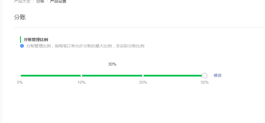 现在已开通了分账功能,但比例这块是一个问题,因最大的分账比例只能设置为30%,虽然说可以申请提高比例,但要填写对应商家信息,提交给腾讯审核,总不能我们合作一家,就给腾讯提交一家的比例提升吧。