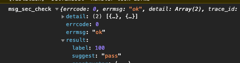 wx.request({ url: 'https://api.weixin.qq.com/wxa/msg_sec_check?access_token=XXX', data: { content: '敏感词', version: 2, scene: 2, openid: 'xxxxxxxx', }, method: 'POST', header: { 'content-type': 'application/json' // 默认值 }, success (res) { console.log('msg_sec_check', res.data) } })