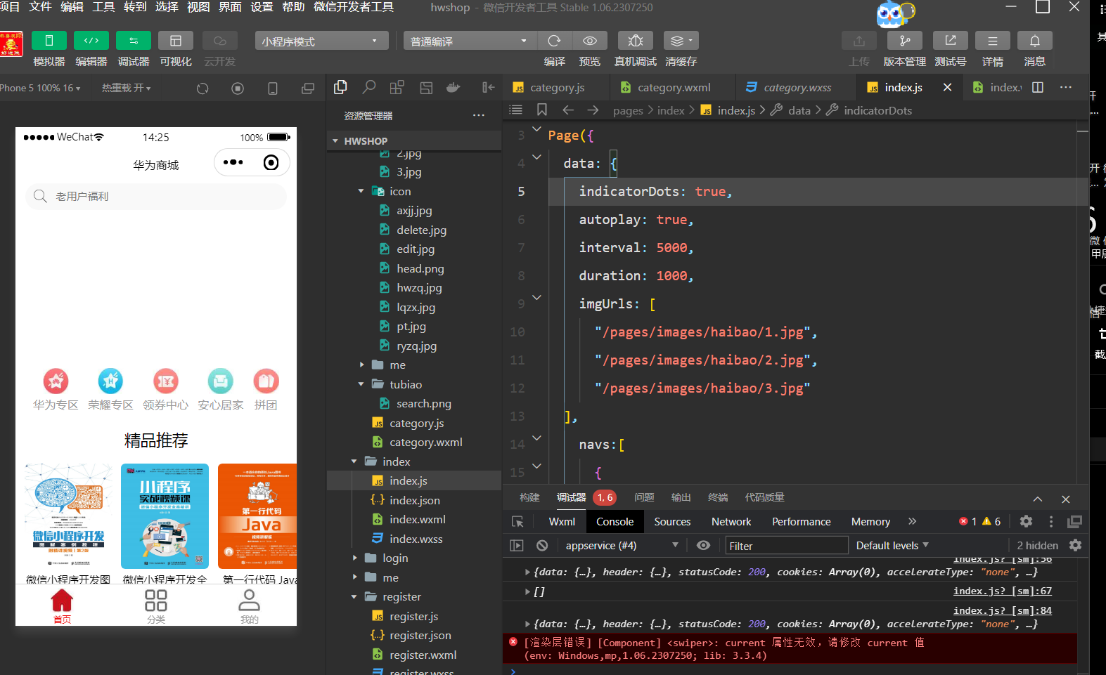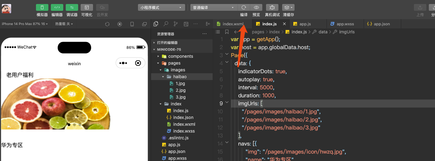 看下 index.wxml 文件的代码,swiper组件填写的current属性无效。
