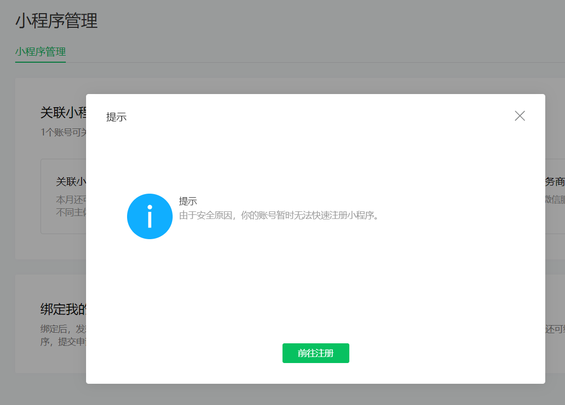 我通过服务号去快速注册,提示“由于安全原因,你的账号暂时无法快速注册小程序”是什么原因?