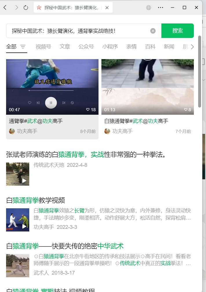 例如:探秘中国武术:猿长臂演化,通背拳实战绝技!