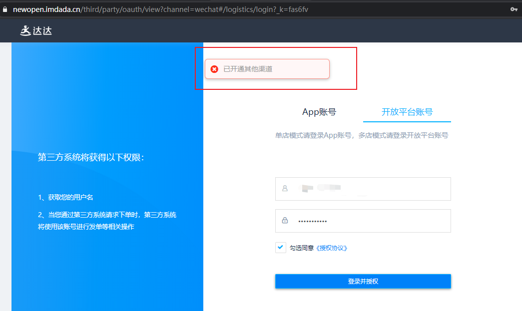 现在碰到的问题:我们申请了两个达达商户号,一个 A,一个 B,现在商户号 A 可以绑定达达开发者,但绑定不了微信即时配送,授权页面提示已开通其他渠道,这个错误提示在达达和微信即时配送的开发文档也找不到是什么意思;商户号 B 在达达系统内提示已经绑定了开发者,但看不到开发者信息,而且开发调试时也报错,但商户号 B 能绑定微信即时配送。