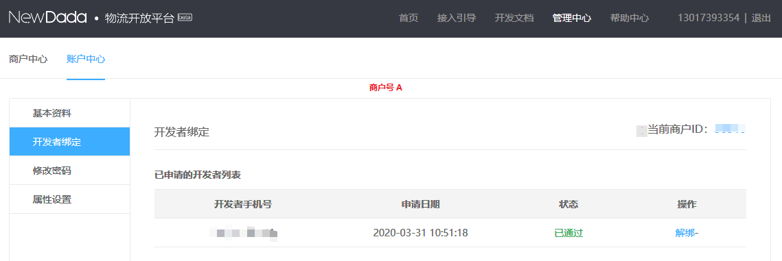 图二 商户号 A 可以绑定达达开发者账号,但可以看到图二和下面的图三是不一样的。
