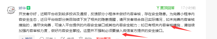 开发者你好,近期平台收到较多投诉及通报,反馈部分小程序未做好内容审核,存在安全隐患。为完善小程序内容安全生态,近日平台给部分类目陆续下发了相关的隐患提醒,请开发者结合自己实际情况,如未完善内容审核措施的,请尽快完善,可接入平台提供的内容安全接口或其他内容安全能力;如已有相关内容审核措施,请继续加强内容审核力度,做好内容安全掌控。这里并不强制必须要接入微信官方提供的安全接口。