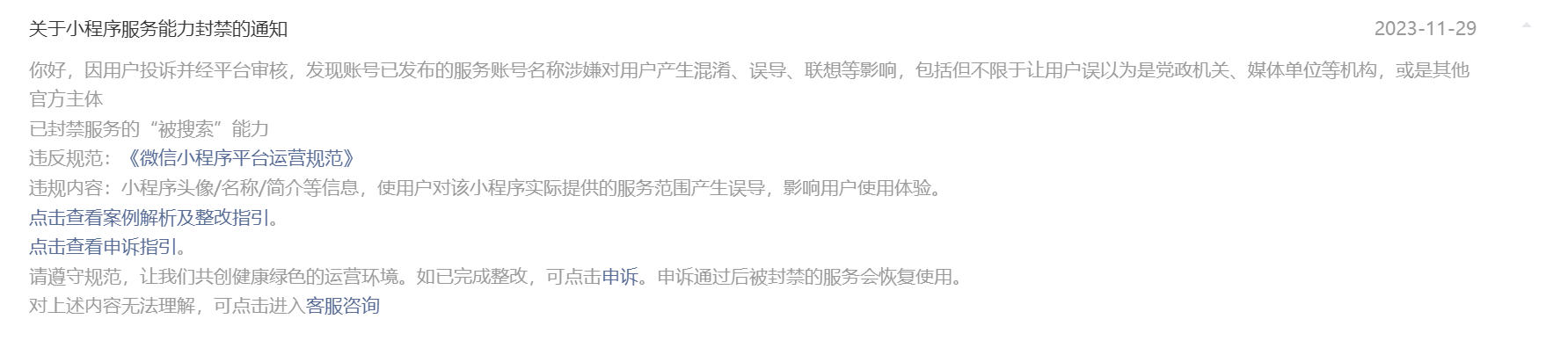 感谢反馈,申诉结果已通过站内信下发,可在mp后台登录查看详情;若发现小程序内存在违规行为,可在小程序内发起举报,平台将对于违规小程序根据实际具体情况进行评估处罚