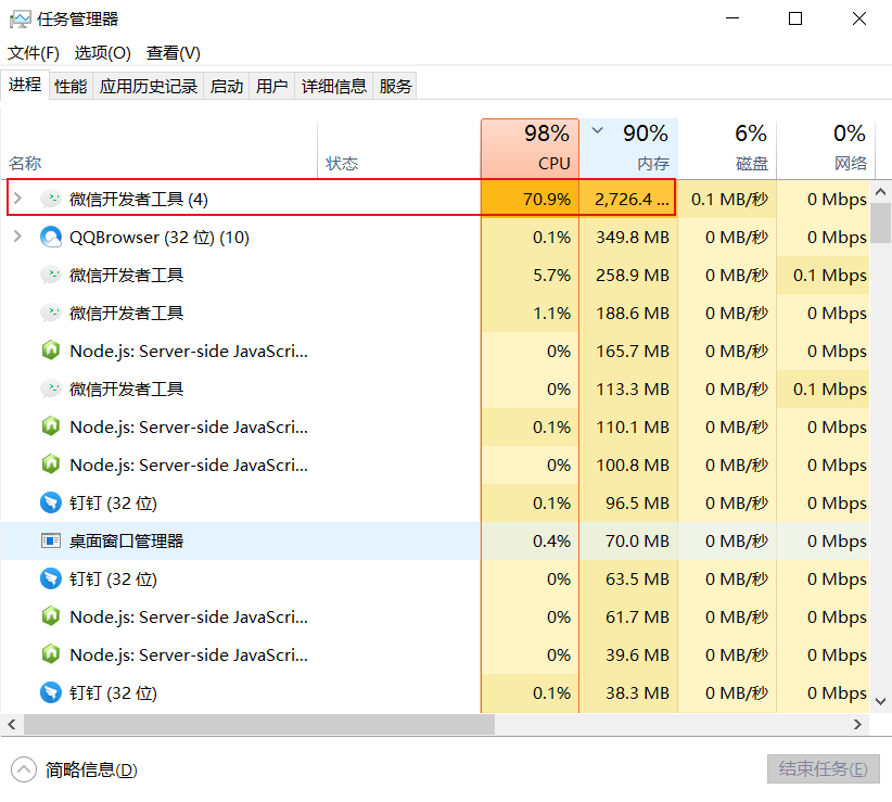 今天我又试了下,进入分包后还是没反应,甚至我的CPU都飙红了,只开了QQ浏览器(只有三个页面),还有钉钉程序,和微信开发工具。