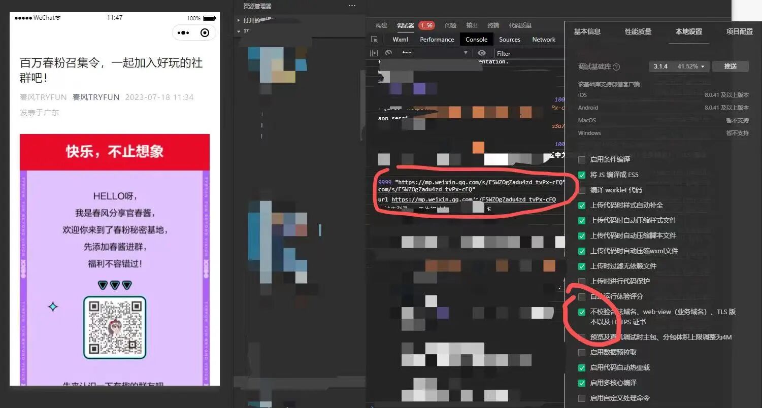 开发者工具好像有点问题,不勾选「不校验域名」就打不开关联公众号文章链接。