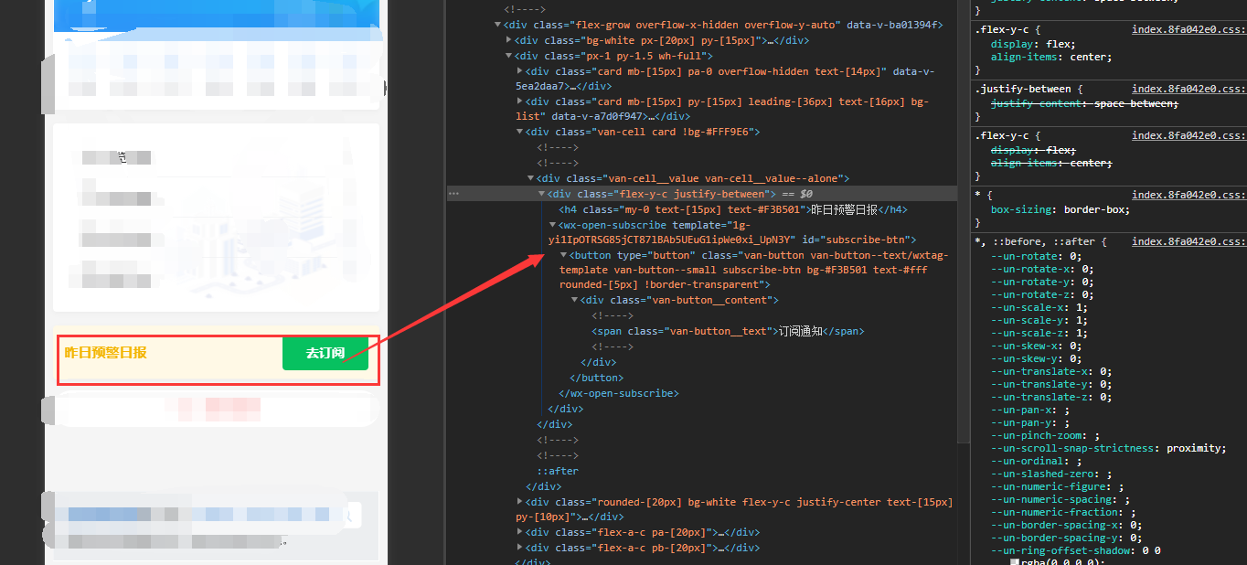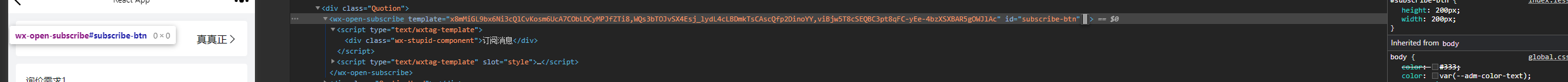 2、改为直接使用自定义元素内容,可成功进行订阅,但是自定义元素内容及样式不生效,微信浏览器上直接形成一个绿色的去订阅按钮,使用开发者工具审查,发现是开放标签下面插入了一个iframe标签,而且有时候这个标签还无法找到,不知是何原因?