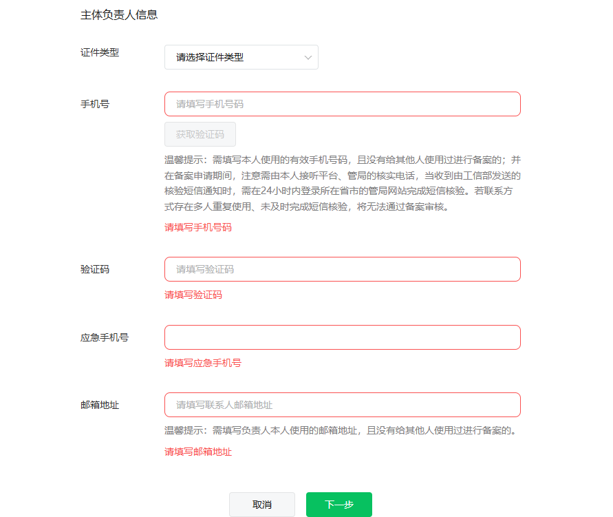 2)在填写负责人手机号、邮箱时,提示“不允许被多人使用”,一般是出现了个人信息混用的情况,即手机号/邮箱填写的是其他人的信息。