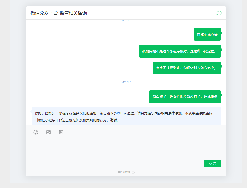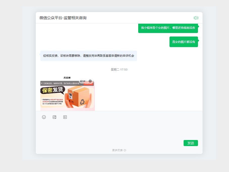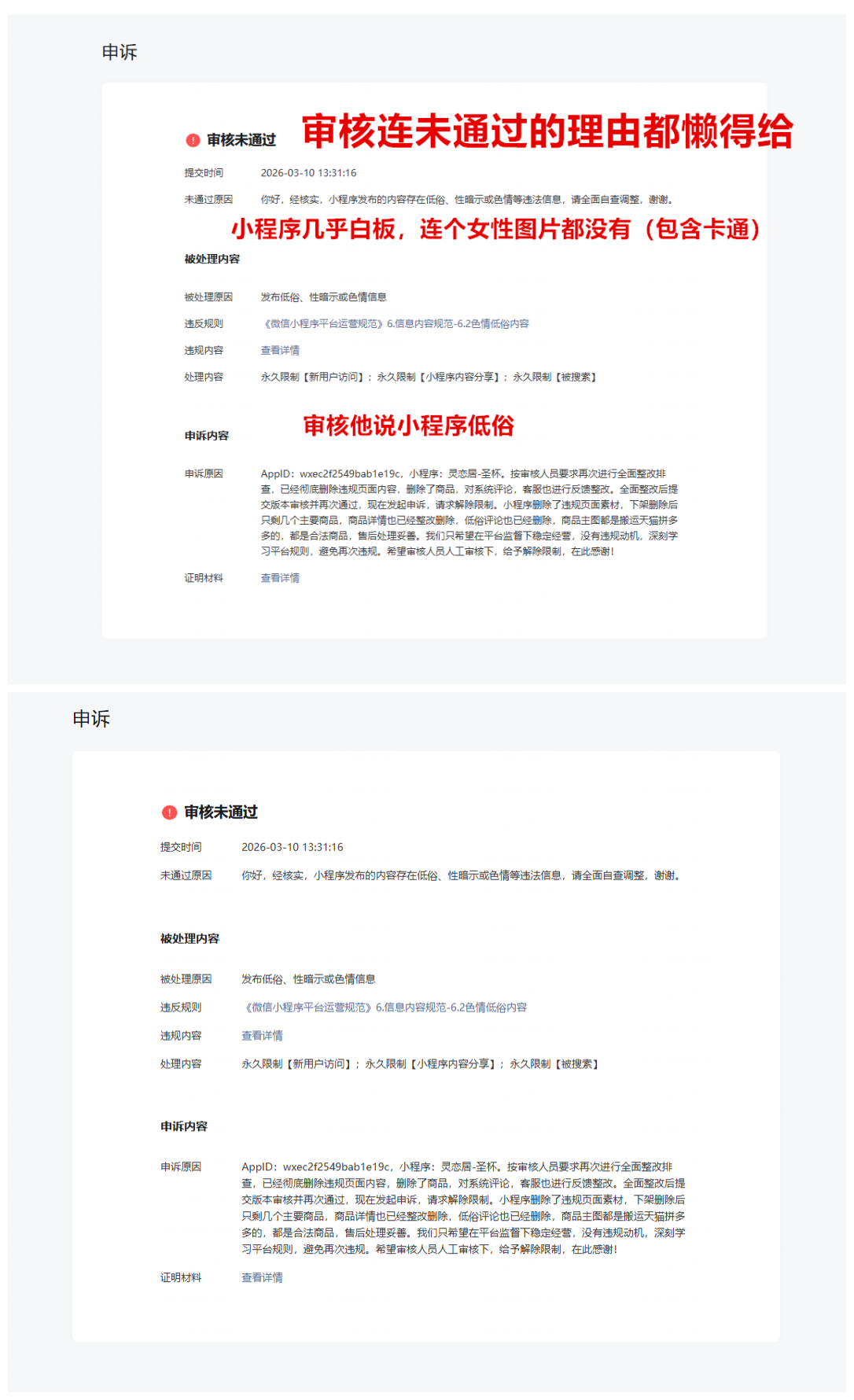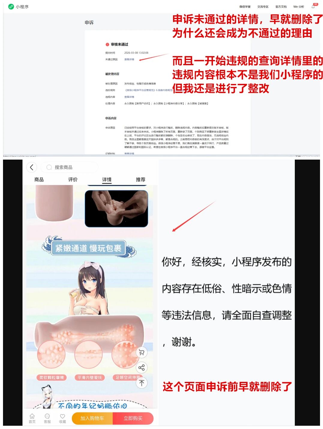 然后我删除了小程序里一切女性图片,文字删除,商品删除详情,评论区也删除,然后进行第一次申诉。