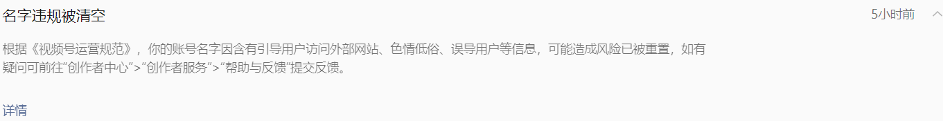 今天收到这个违规通知,视频号名字被清空了