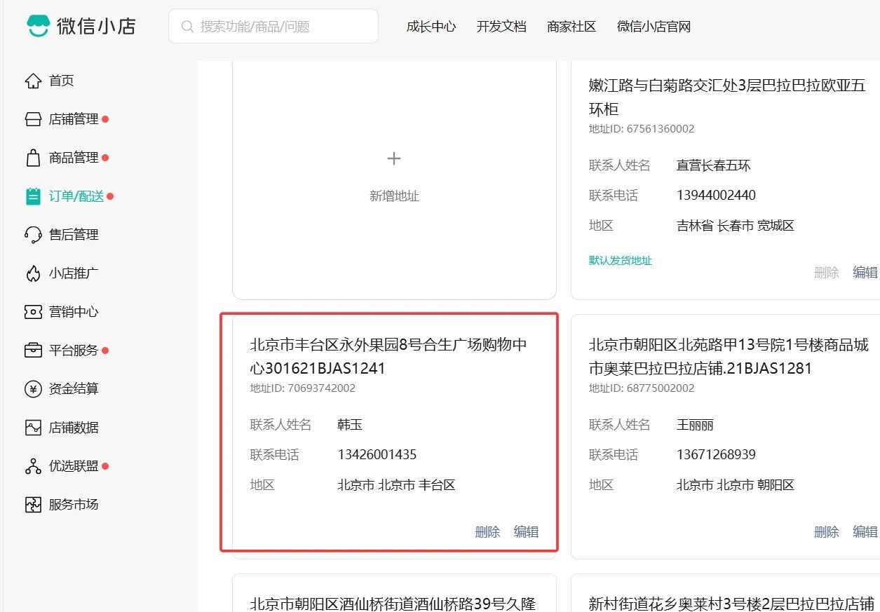 {"errcode":0,"total_num":23,"errmsg":"ok","account_list":[{"cancel":0,"company_type":2,"balance_retcode":0,"balance_retmsg":"OK","delivery_id":"DBKD","acct_type":0,"available":0,"shop_id":"5009820028527","acct_id":"6639520331","sender_address":{"address":"酒仙桥街道酒仙桥路39号久隆百货3层","province":"北京市","city":"北京市","county":"朝阳区"},"recycled":0,"share":{},"delivery_msg":"","monthly_card":"507594436","status":3,"allocated":0},{"cancel":0,"company_type":2,"balance_retcode":0,"balance_retmsg":"OK","delivery_id":"DBKD","acct_type":0,"available":0,"shop_id":"5009820028527","acct_id":"6639266070","sender_address":{"address":"永外果园8号合生广场购物中心3016","province":"北京市","city":"北京市","county":"丰台区"},"recycled":0,"share":{},"delivery_msg":"","monthly_card":"507594436","status":3,"allocated":0},{"cancel":0,"company_type":2,"balance_retcode":0,"balance_retmsg":"OK","delivery_id":"DBKD","acct_type":0,"available":0,"shop_id":"5009820028527","acct_id":"6639262076","sender_address":{"address":"城南街道南口路乐多港万达广场","province":"北京市","city":"北京市","county":"昌平区"},"recycled":0,"share":{},"delivery_msg":"","monthly_card":"507594436","status":3,"allocated":0},{"cancel":0,"company_type":2,"balance_retcode":0,"balance_retmsg":"OK","delivery_id":"DBKD","acct_type":0,"available":0,"shop_id":"5009820028527","acct_id":"6639647601","sender_address":{"address":"新村街道花乡奥莱村3号楼2层巴拉巴拉店铺","province":"北京市","city":"北京市","county":"丰台区"},"recycled":0,"share":{},"delivery_msg":"","monthly_card":"507594436","status":3,"allocated":0},{"cancel":0,"company_type":2,"balance_retcode":0,"balance_retmsg":"OK","delivery_id":"DBKD","acct_type":0,"available":0,"shop_id":"5009820028527","acct_id":"6639305734","sender_address":{"address":"北苑路甲13号院1号楼商品城市奥莱巴拉巴拉店铺","province":"北京市","city":"北京市","county":"朝阳区"},"recycled":0,"share":{},"delivery_msg":"","monthly_card":"507594436","status":3,"allocated":0},{"cancel":0,"company_type":2,"balance_retcode":0,"balance_retmsg":"OK","delivery_id":"DBKD","acct_type":0,"available":0,"shop_id":"5009820028527","acct_id":"6639528274","sender_address":{"address":"王佐镇福宫路3号恒源商厦3层巴拉巴拉","province":"北京市","city":"北京市","county":"丰台区"},"recycled":0,"share":{},"delivery_msg":"","monthly_card":"507594436","status":3,"allocated":0},{"cancel":0,"company_type":2,"balance_retcode":0,"balance_retmsg":"OK","delivery_id":"DBKD","acct_type":0,"available":0,"shop_id":"5009820028527","acct_id":"6639510318","sender_address":{"address":"马连道路10号2层","province":"北京市","city":"北京市","county":"西城区"},"recycled":0,"share":{},"delivery_msg":"","monthly_card":"507594436","status":3,"allocated":0},{"cancel":0,"company_type":2,"balance_retcode":0,"balance_retmsg":"OK","delivery_id":"DBKD","acct_type":0,"available":0,"shop_id":"5009820028527","acct_id":"6639514300","sender_address":{"address":"科创五街38号北京大兴世纪广场奥莱3层巴拉巴拉","province":"北京市","city":"北京市","county":"大兴区"},"recycled":0,"share":{},"delivery_msg":"","monthly_card":"507594436","status":3,"allocated":0},{"cancel":0,"company_type":2,"balance_retcode":0,"balance_retmsg":"OK","delivery_id":"DBKD","acct_type":0,"available":0,"shop_id":"5009820028527","acct_id":"6639472873","sender_address":{"address":"沙河万达广场A栋-3F-01","province":"北京市","city":"北京市","county":"昌平区"},"recycled":0,"share":{},"delivery_msg":"","monthly_card":"507594436","status":3,"allocated":0},{"cancel":0,"company_type":2,"balance_retcode":0,"balance_retmsg":"OK","delivery_id":"DBKD","acct_type":0,"available":0,"shop_id":"5009820028527","acct_id":"6639655566","sender_address":{"address":"-朝阳北路17号常营华联3层巴拉巴拉","province":"北京市","city":"北京市","county":"朝阳区"},"recycled":0,"share":{},"delivery_msg":"","monthly_card":"507594436","status":3,"allocated":0},{"cancel":0,"company_type":2,"balance_retcode":0,"balance_retmsg":"OK","delivery_id":"DBKD","acct_type":0,"available":0,"shop_id":"5009820028527","acct_id":"6639526314","sender_address":{"address":"中关村南大街2号数码大厦B座华宇购物中心巴拉巴拉店铺","province":"北京市","city":"北京市","county":"海淀区"},"recycled":0,"share":{},"delivery_msg":"","monthly_card":"507594436","status":3,"allocated":0},{"cancel":0,"company_type":2,"balance_retcode":0,"balance_retmsg":"OK","delivery_id":"DBKD","acct_type":0,"available":0,"shop_id":"5009820028527","acct_id":"6639472871","sender_address":{"address":"东坝中路38号楼金隅嘉品MALL3层巴拉巴拉","province":"北京市","city":"北京市","county":"朝阳区"},"recycled":0,"share":{},"delivery_msg":"","monthly_card":"507594436","status":3,"allocated":0},{"cancel":0,"company_type":2,"balance_retcode":0,"balance_retmsg":"OK","delivery_id":"DBKD","acct_type":0,"available":0,"shop_id":"5009820028527","acct_id":"6639773189","sender_address":{"address":"鸿坤广场二层巴拉巴拉","province":"北京市","city":"北京市","county":"大兴区"},"recycled":0,"share":{},"delivery_msg":"","monthly_card":"507594436","status":3,"allocated":0},{"cancel":0,"company_type":2,"balance_retcode":0,"balance_retmsg":"OK","delivery_id":"DBKD","acct_type":0,"available":0,"shop_id":"5009820028527","acct_id":"6639579960","sender_address":{"address":"华佗路2号凯德MALL3层04号","province":"北京市","city":"北京市","county":"大兴区"},"recycled":0,"share":{},"delivery_msg":"","monthly_card":"507594436","status":3,"allocated":0},{"cancel":0,"company_type":2,"balance_retcode":0,"balance_retmsg":"OK","delivery_id":"DBKD","acct_type":0,"available":0,"shop_id":"5009820028527","acct_id":"6639247724","sender_address":{"address":"新发路欧亚奥特莱斯2搂巴拉巴拉展位","province":"吉林