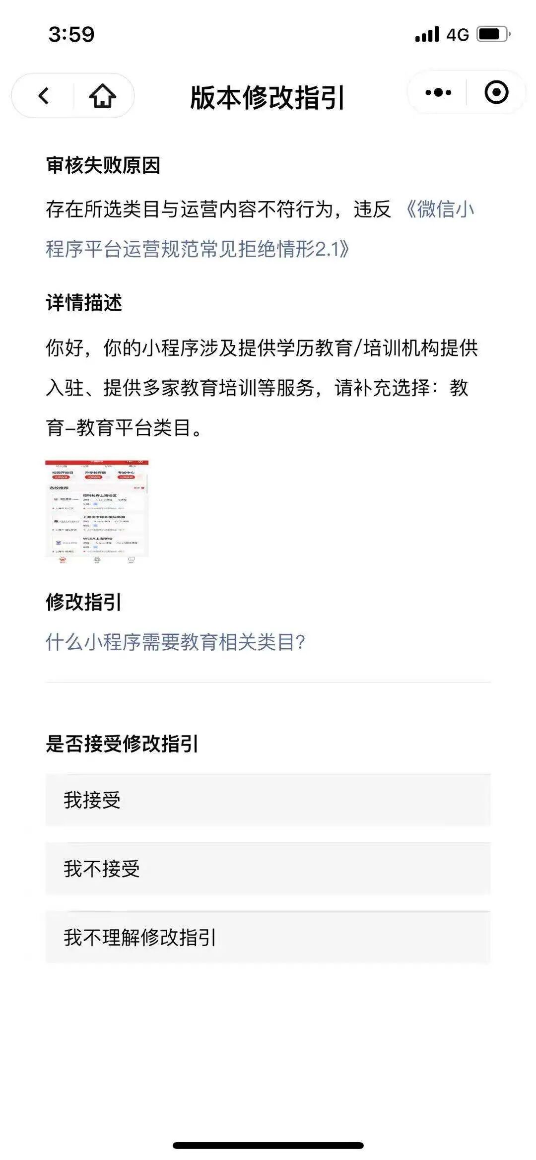你好,经核实,你的小程序提供学历教育/培训机构提供入驻、提供多家教育培训等服务,请补充选择:教育-教育平台类目。