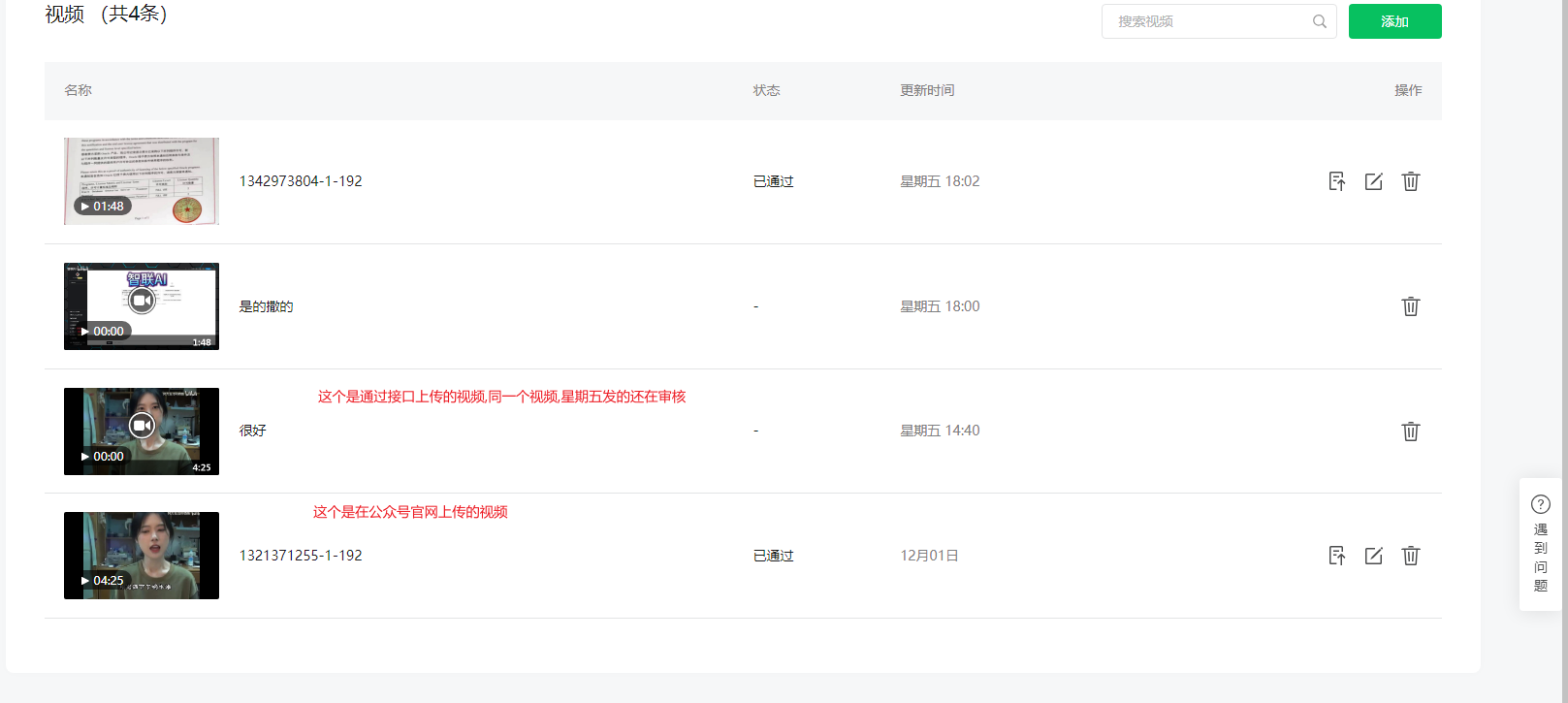 我通过公众号官网接口<新增永久素材>接口上传的视频一直在审核,但是同一个视频我在公众号号后台上传的一下就通过了,是什么原因