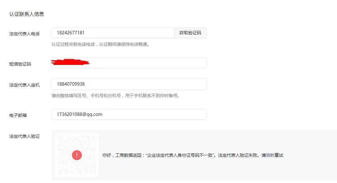 国家企业信息公示网已经能查到企业信息,但是申请微信认证一直不通过,工商数据返回:“企业法定代表人身份证号码不一致”。法定 代表人验证失败。请刷新重试 。附工商局企业查询信息截图。