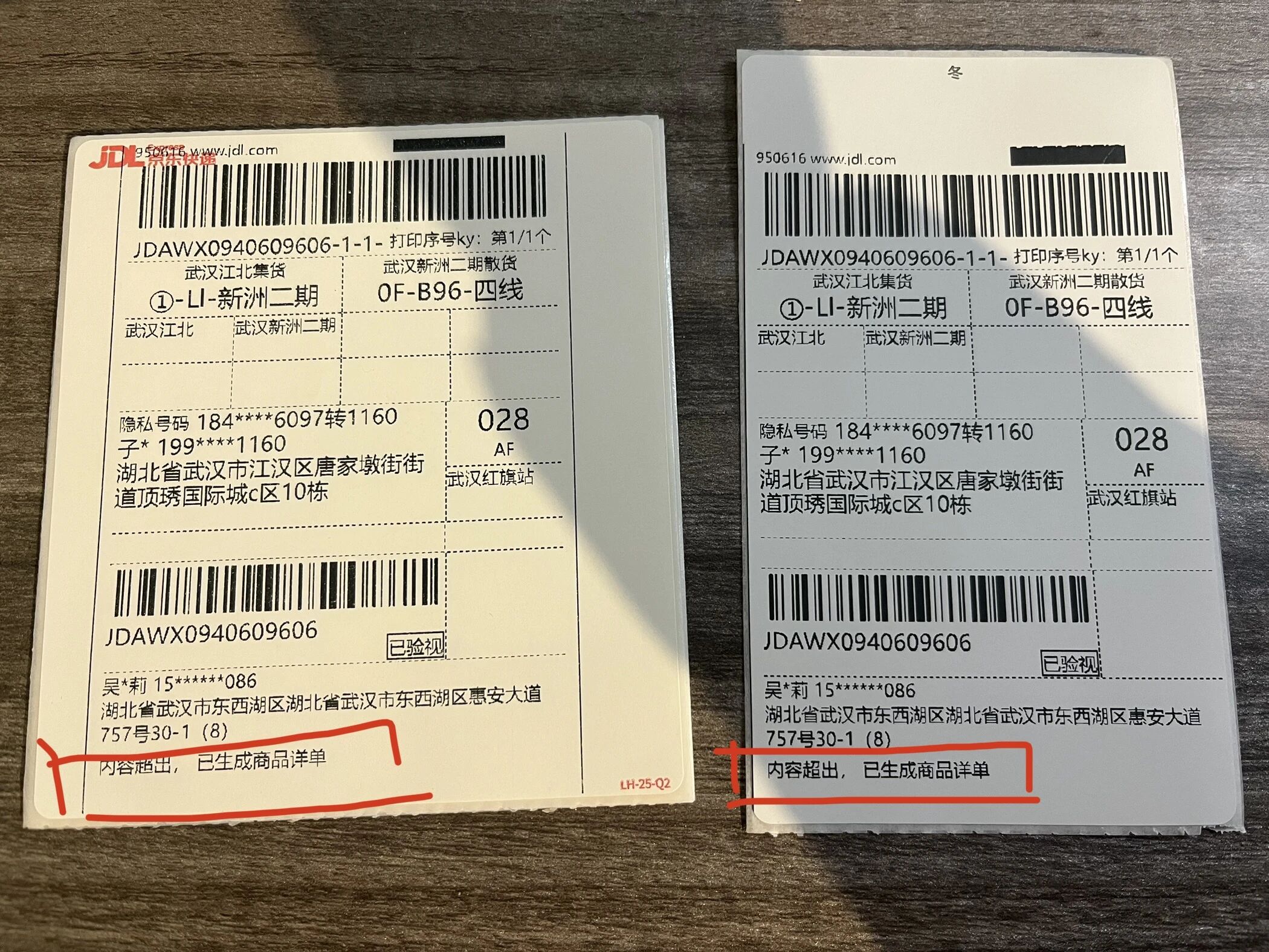 { "ewaybill_order_id": "5373774493949795022", "delivery_id": "JD", "site_code": "010K3689480", "ewaybill_acct_id": "6635126364", "template_id": "6634610466", "sender": { "name": "吴波莉", "mobile": "15807111086", "province": "湖北省", "city": "武汉市", "county": "东西湖区", "street": "", "address": "湖北省武汉市东西湖区惠安大道757号30-1(8)" }, "receiver": { "name": "子*", "mobile": "199****1160", "province": "湖北省", "city": "武汉市", "county": "江汉区", "street": "", "address": "****" }, "ec_order_list": [ { "ec_order_id": 3732859648759970000, "goods_list": [ { "good_name": "1*12*200ml优酸乳黄油芝士味(乐享装)", "good_count": 1 } ] } ], "shop_id": "5009820350429" } 问题时间:2025-12-11 09:11:45 订单号:3732859648759969792 商品:1*12*200ml优酸乳黄油芝士味(乐享装)
