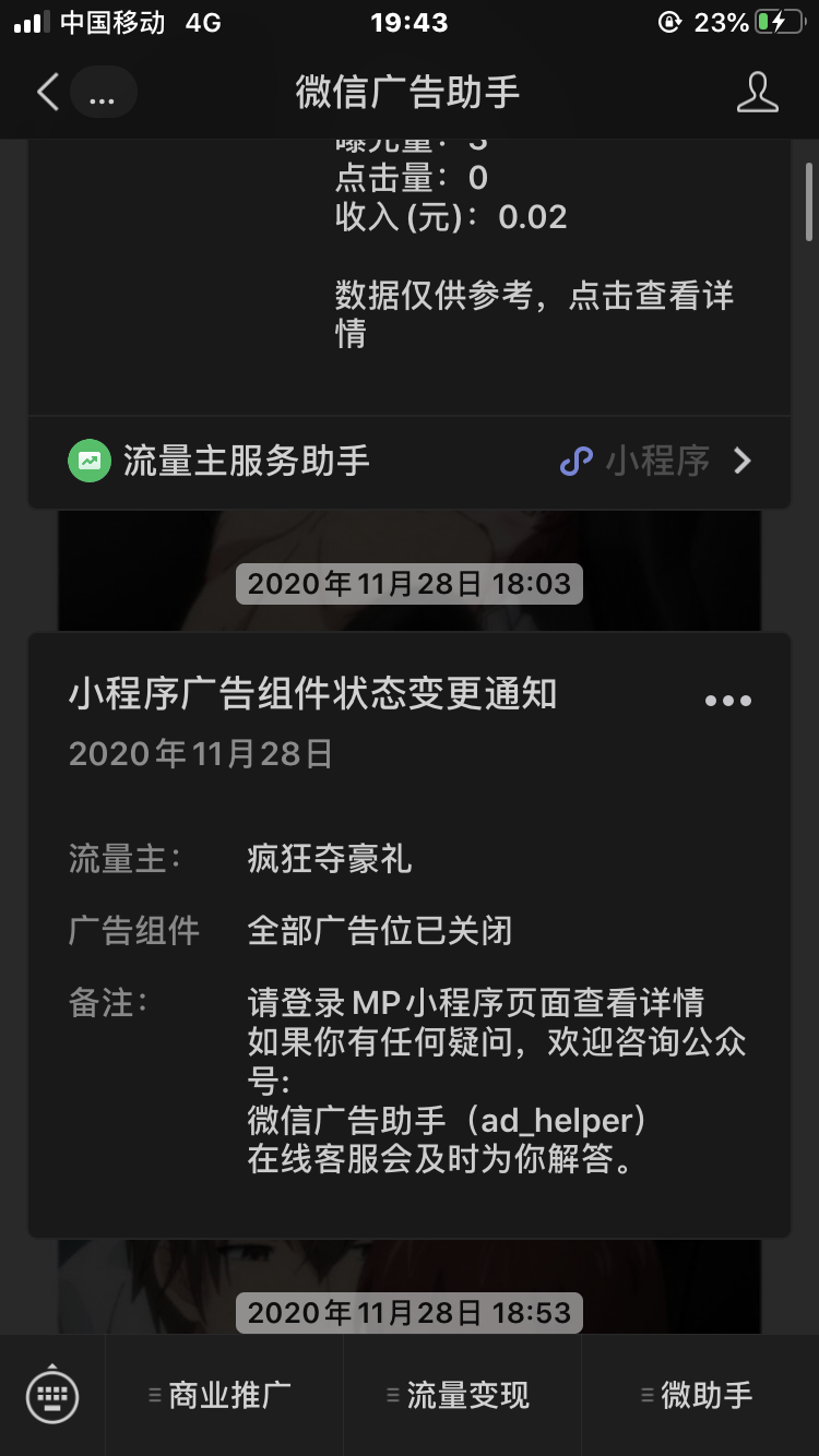 你好!是这样的我是一名在校高中学生!我用我省出来的生活费购买了服务器和搭建了一个小程序!望开通流量主来赚取点生活费!搭建的小程序的第二天我就通过各种渠道推广引流也就是17号搭建的18号我就推广够了用户开通了流量主!刚开通了流量主的第二天我的小程序域名因为备案问题小程序就打不开了,可能是因为这个情况导致的小程序用户数据出现了问题导致后面我的用户越来越少,就被检测出来以为是刷的粉丝!图证据已经发上来了望明查!