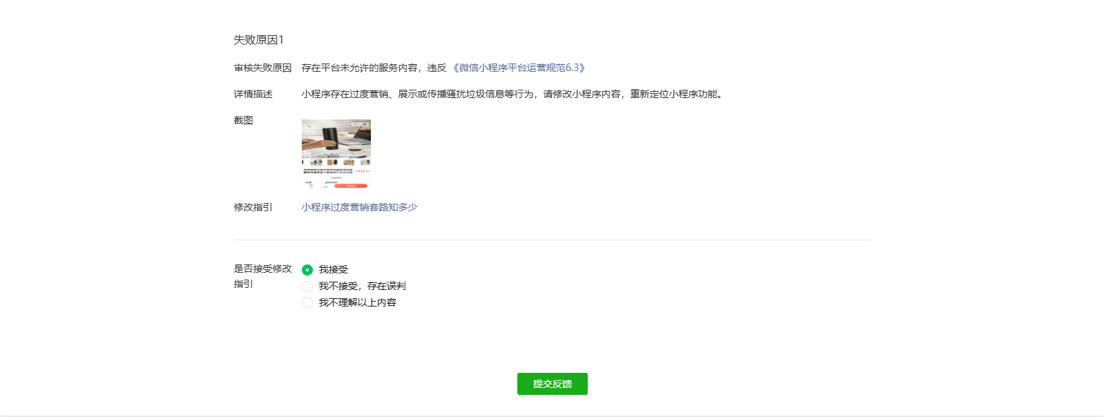小程序的服务类目是资讯 > 信息资讯。小程序的主体内容是展示公司产品,其中包含标题,市场价格,商品详情,sku图等等信息。在2025年10月17日10:27上传时被驳回,我想问是否可以通过新增服务类目为电商/交易等类目进行发布。若不能,可否告知具体修改内容