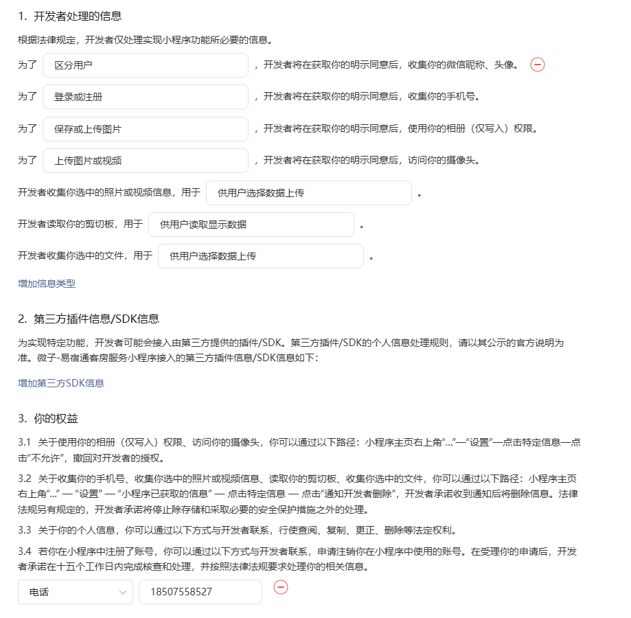 你好,你的小程序“微子-易宿通客房服务”用户隐私保护指引审核因用户信息授权描述不明确、不清晰,本次审核不通过,建议修改后重新提交。