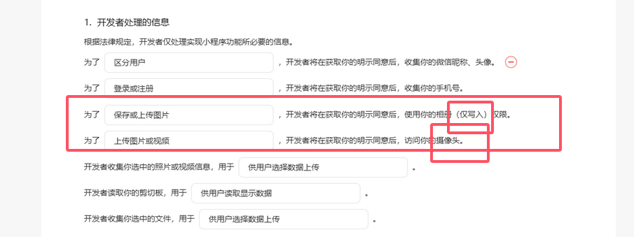 平台提示:接口用途内容说明需要填写合理使用内容,避免无关内容,小程序隐私保护指引内容(含补充文件内容)审核通过后将公开展示在《用户隐私保护指引》内容页面。