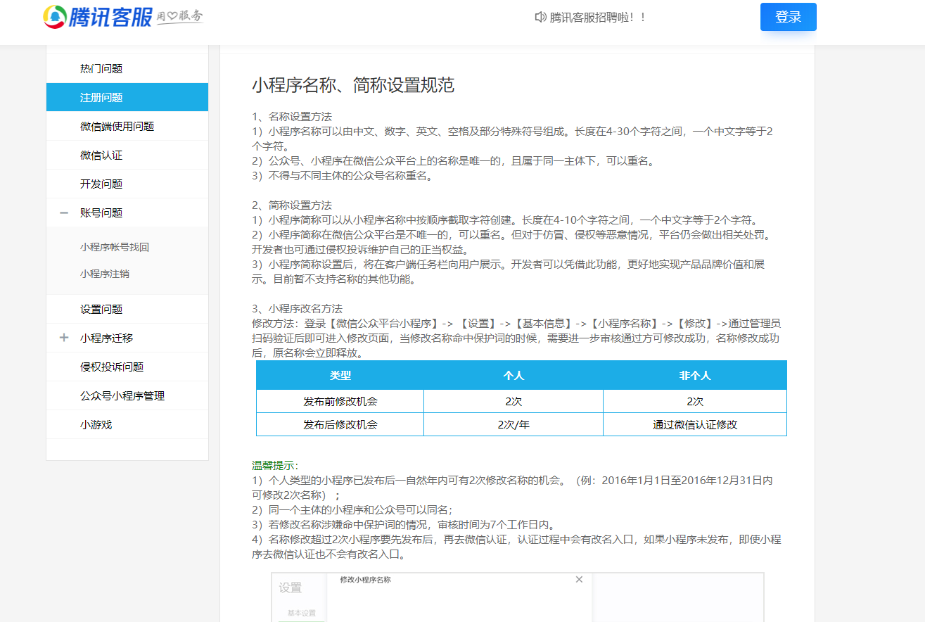 腾讯客服查询 小程序发布后可以通过微信认证每年修改2次名字,但没有提及收费事项