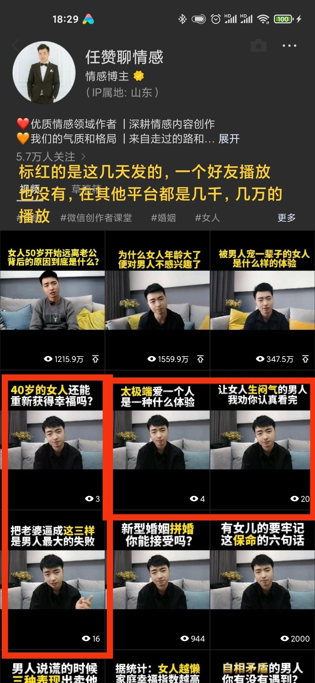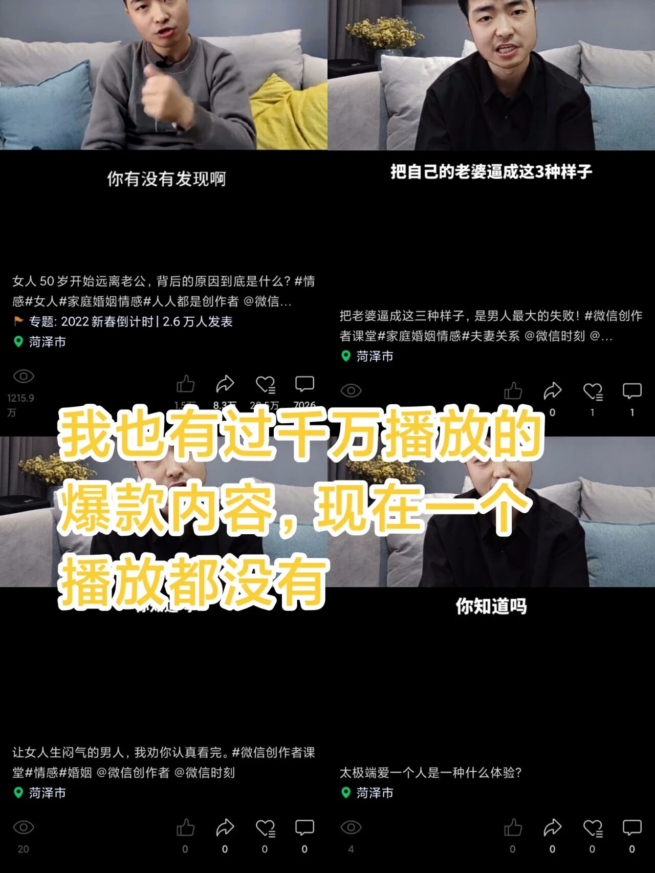 我的视频号:任赞聊情感,从7月14号开始到现在,从关注到朋友到推荐三个栏目里面全部到刷不到,做过测试,关注之后,通过点击关注栏,无法刷到此账号的任何视频,连续几天都试过了,我就算发再好的作品,粉丝看不到,微信好友看不到,推荐栏更刷不到,这次视频号更新之后,我的账号就出问题了,我的账号就算再差,5.7万粉丝,浏览量也不至于一点播放量没有,现在浏览量成个位数了,我的作品别人都刷不到,我苦心经营1年多的账号就这样废了。希望能够让视频号技术部门专业人员给看一下,尽快给解决一下。