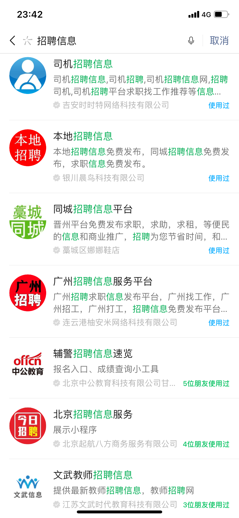 搜索同城招聘和招聘信息出不来,搜索同城招聘信五个相同的字都搜索不到,向下拉到底几百个都没有,是什么原因,必须搜索同城招聘信息,以前能搜索出来,这是为什么呢,是不是被限流了,最近也没有任何违规现象,小程序有20多万用户的,之前每天增加几百个新用户的,现在无缘无故的搜索不到了,并且搜一搜里面的搜索词只有全称的同城招聘信息,明显只能通过全称搜索到
