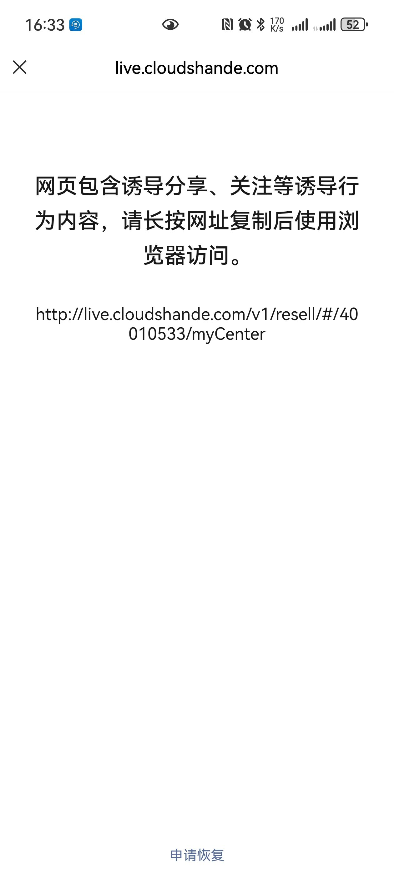 尊敬的管理员,链接点击后跳转“网页包含诱导分享、关注等诱导行为内容,请长按网址复制后使用浏览器访问”部分内容我们已做整改,请管理员复查,并解除风险提示。感谢!域名:cloudshande.com并告知是否被举报