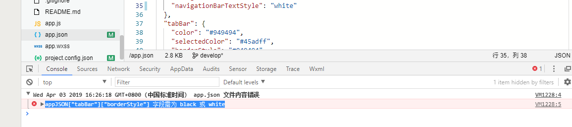 appJSON["tabBar"]["borderStyle"] 字段需为 black 或 white