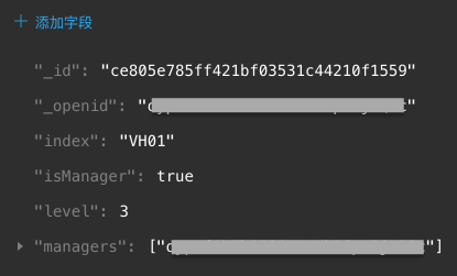{ "read": "doc._openid == auth.openid || auth.openid in get(`database.manager.ce805e785f******0f1559`).managers", "write": "doc._openid == auth.openid || auth.openid in get(`database.manager.ce805e785f******10f1559`).managers" }其中“ce805e785f******0f1559”为 manager集合的索引_id