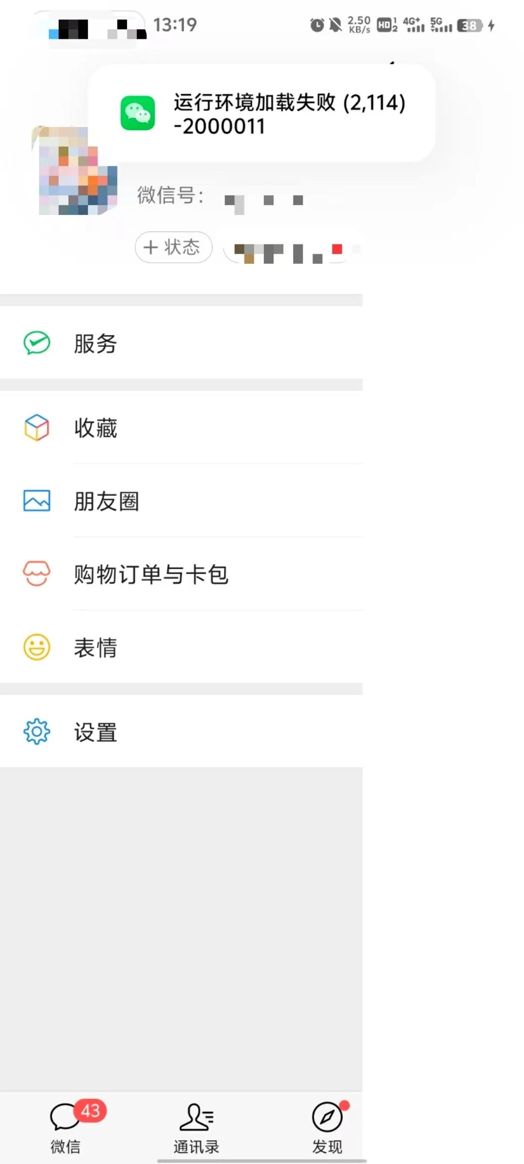 安卓微信APP- 打开我页面->点击购物订单与卡包,报错“运行环境加载失败(2,114)”