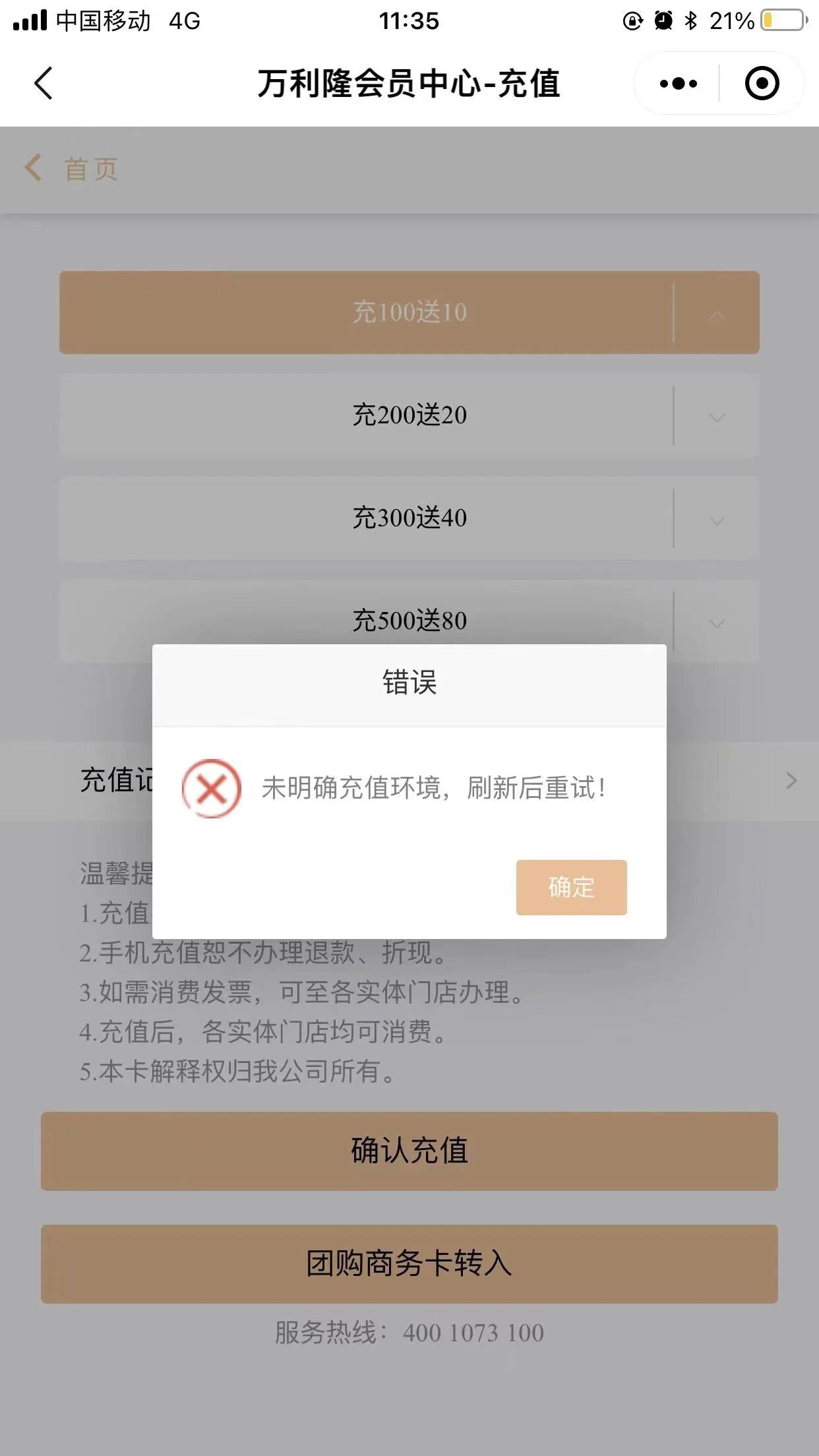在小程序里面,做了跳转到充值的页面,结果显示【未明确充值环境,刷新后重试】,但是单独在微信聊天窗口点击链接是可以操作。这个是什么原因呢?充值链接如下http://diancan.willove.top/AmtInc.aspx