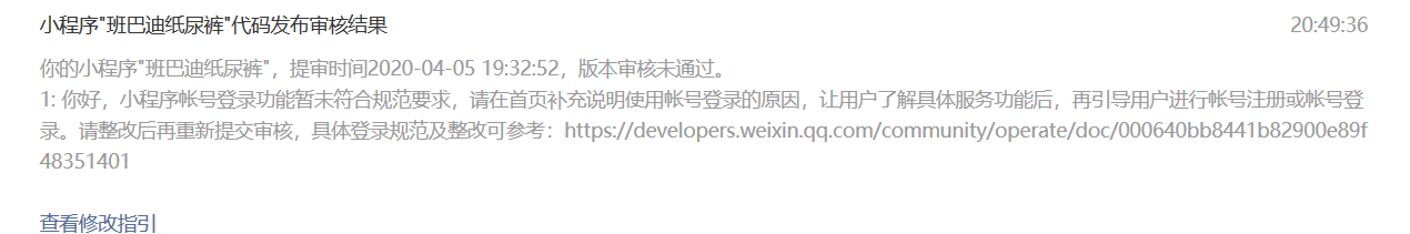 你好,核实到小程序属于服务范围特定的小程序,但页面无相关说明以及使用范围提示,暂未符合登录规范要求。为确保用户体验,建议在首页说明增加特定范围使用说明或提示后再引导用户进行帐号登录。请整改后再提交代码审核,具体登录规范及整改可参考: