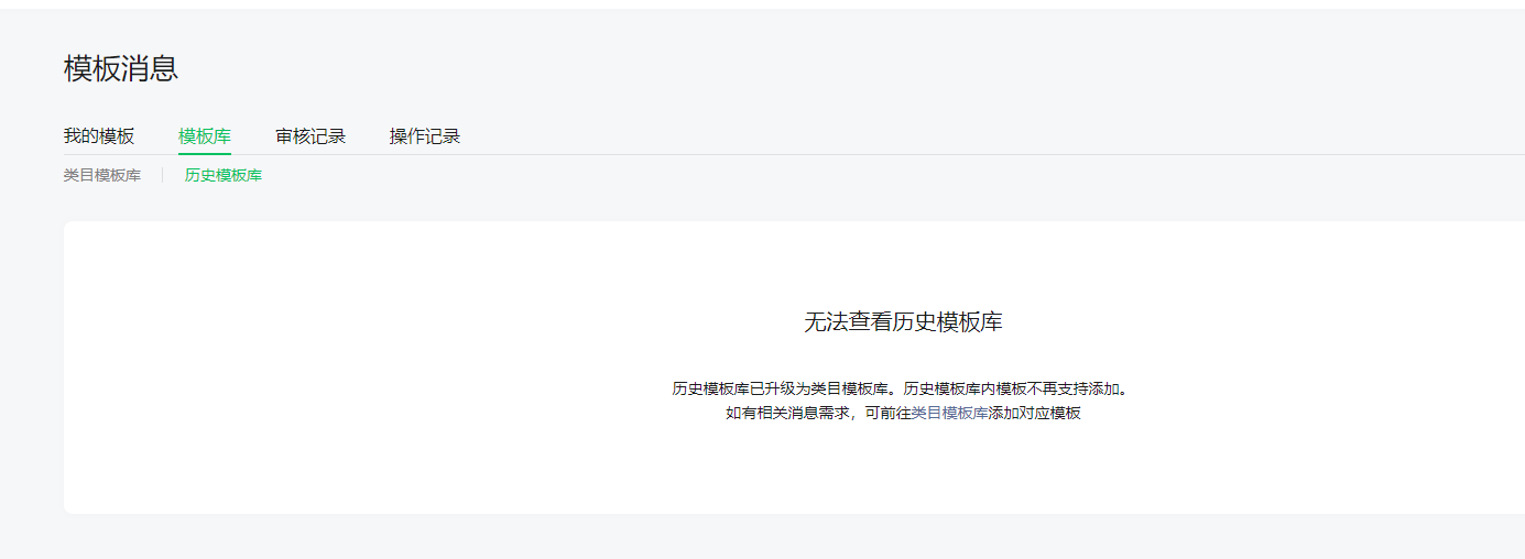 你好,为了更规范化管理模板消息能力,模板公共库由7月4日起全面升级,原历史模板库废弃停用,后续的服务类通知需求,请在「模板消息 > 模板库 > 类目模板库」添加对应模板