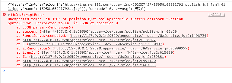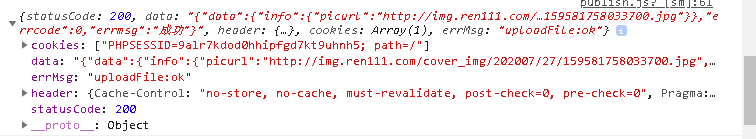 {statusCode: 200, data: "•{"data":{"info":{"picurl":"http://img.ren111.com/…159581758033700.jpg"}},"errcode":0,"errmsg":"成功"}", header: {…}, cookies: Array(1), errMsg: "uploadFile:ok"}cookies: ["PHPSESSID=9alr7kdod0hhipfgd7kt9uhnh5; path=/"]data: "•{"data":{"info":{"picurl":"http://img.ren111.com/cover_img/202007/27/159581758033700.jpg","name":"159581758033700.jpg"}},"errcode":0,"errmsg":"成功"}"errMsg: "uploadFile:ok"header: {Cache-Control: "no-store, no-cache, must-revalidate, post-check=0, pre-check=0", Pragma: "no-cache", Content-Type: "application/json", Expires: "Thu, 19 Nov 1981 08:52:00 GMT", Server: "Microsoft-IIS/8.5", …}statusCode: 200__proto__: Object