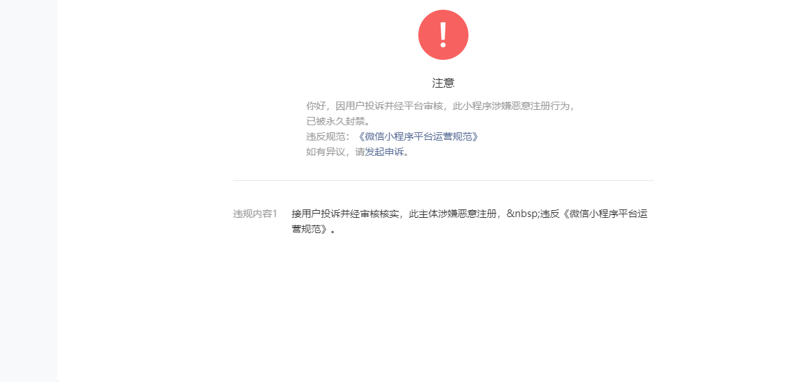 注册的小程序有几个月了 ,好久没用之后现在被封了,说有用户举报我接用户投诉并经审核核实,此主体涉嫌恶意注册, 违反《微信小程序平台运营规范》。然后申诉也没用