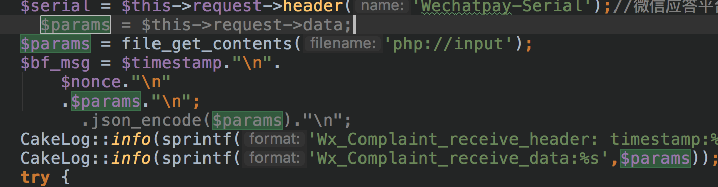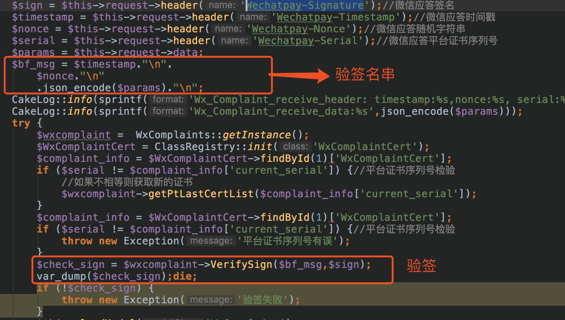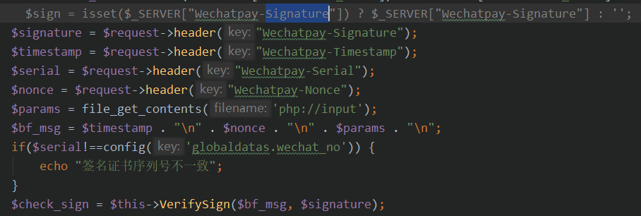 注释调的是我原来获取参数,并且构建签名串的方式,现在采用原生的方式就校验通过了