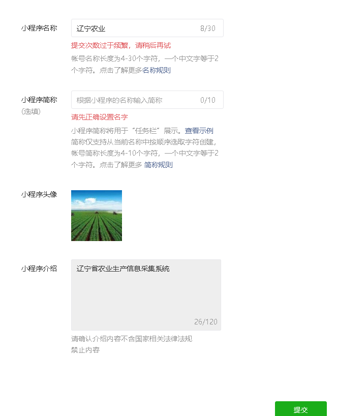 小程序信息去填写的时候,小程序名称尝试几次不让用,换着换着就提示提交次数过于频繁,请稍后再试,我就随便选个头像和输入点介绍,结果提交不成功,再次进入的时候,头像和小程序介绍不让修改了,怎么回事?