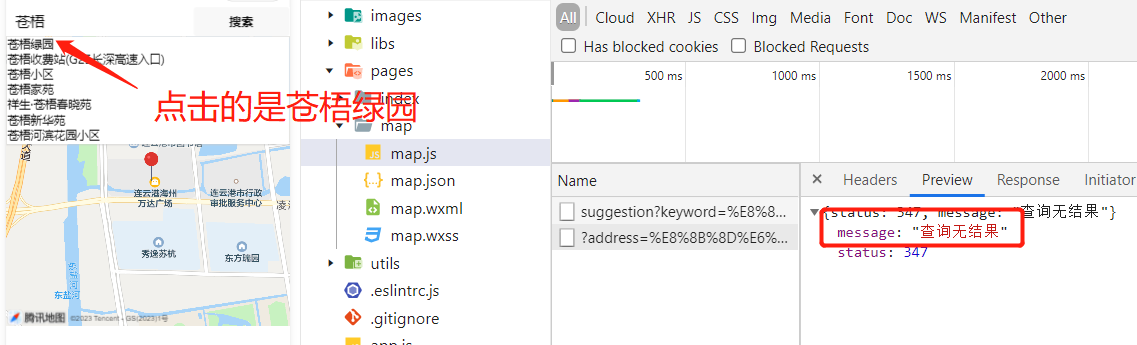 2、发现有时候输入万达两个字下面会出现一系列地址,我随意点击一个,在调试器中的网络请求中显示查询无结果。可是这个地址明明是存在的呀。