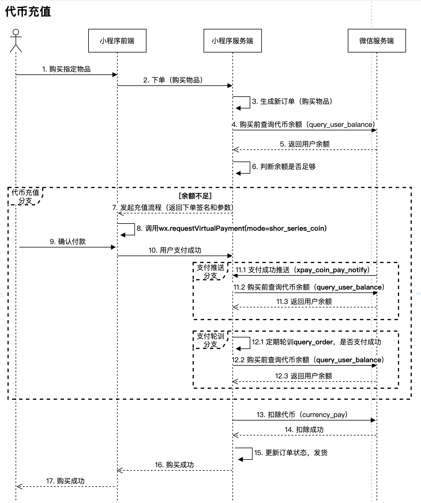 流程里第4步为什么要查询用户代币余额,余额不足才走付款,以及第13步,先调用扣除代币,再发货。微信不是只要回调用户支付成功给业务端,业务端直接发货就好了吗?现在这样的流程不就会导致微信上有个用户余额账户,业务也有个余额账户,用户还可以再app内充值的,两边对不上怎么办