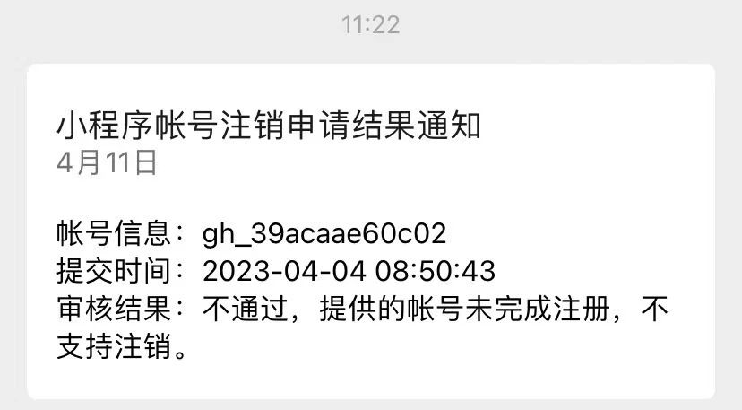 跟你一样情况,注册途中发现不对想中断。但是找客服注销提示(不通过,提供的账号未完成注册,不支持注销),如果完成注册就要交300块钱,我都不想注册了为什么还要交钱注册再注销,这是不是在搞笑!!!小程序(gh_39acaae60c02)