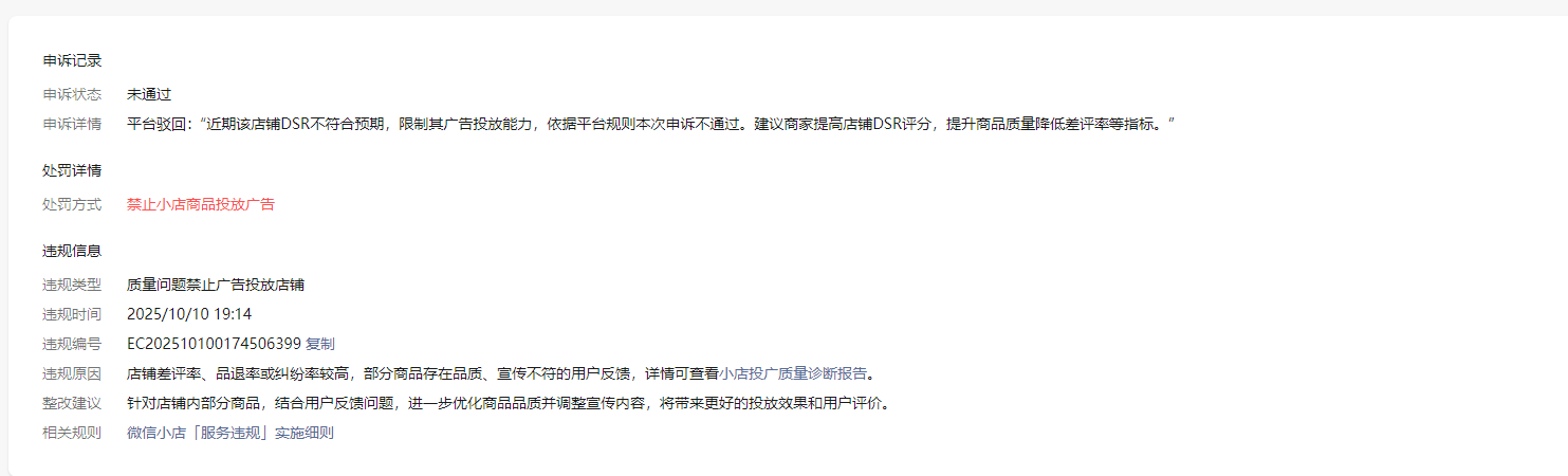 您好!关于您咨询的“微信小店里的广告功能审核不通过跟实情不符合,想要提交申诉没有入口,希望管理人员能帮帮忙看下?”的问题,为您说明如下:经核实,处罚已于2026-03-30解除广告限制。